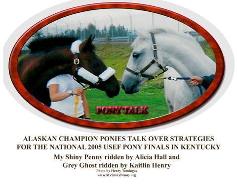Competing in Lexington Kentucky at the USEF PONY FINALS August 2005 in high heat and humidity after long flights and new surroundings, Penny and Alicia got their chance to represent Alaska in their first National event. This is the caliber of event where serious errors such as balking almost never occur making the judges job very hard so the obstacle course designers set the jumps and decorations to where it confuses and complicates every moment in an arena filled with experts and aficionados of the sport.  The pressures are similar to the Olympics where remaining calm, cool and collected is a lost memory.  When it came time for Penny and Alicia to compete, they calmly road out and turned in complete rounds cool and collected without a noticeable flaw placing them well in the field ahead of over fifty of the nation’s top champion ponies. Alaska can be very proud of them.  Look for a full page interview of Alicia in the USEF Magazine October 2005.
